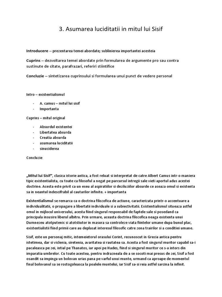 Asumarea Luciditatii In Mitul Lui Sisif Docx