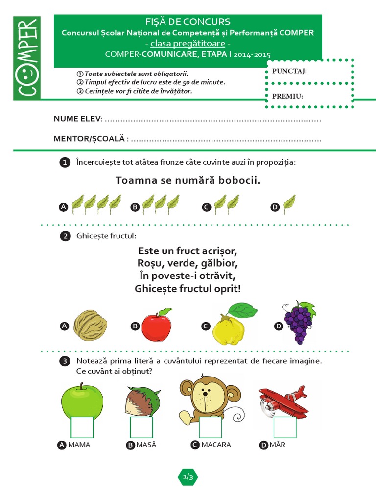 Fișă De Concurs Clasa Pregătitoare