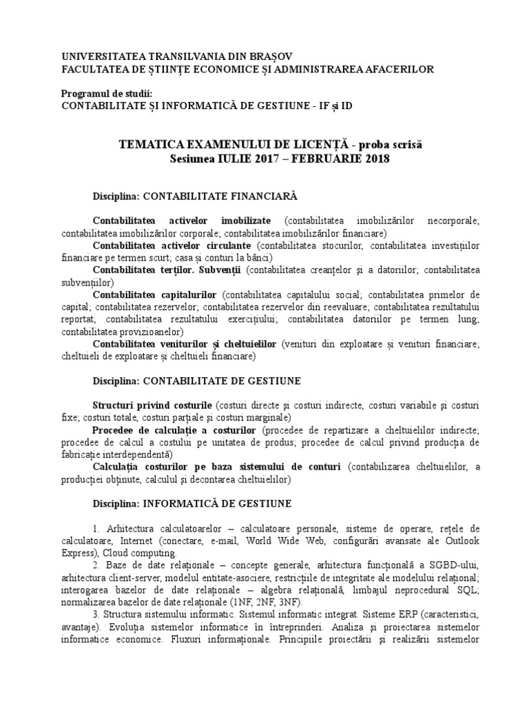 Tematica Examen Scris Licenta Contabilitate Si Informatica De Gestiune