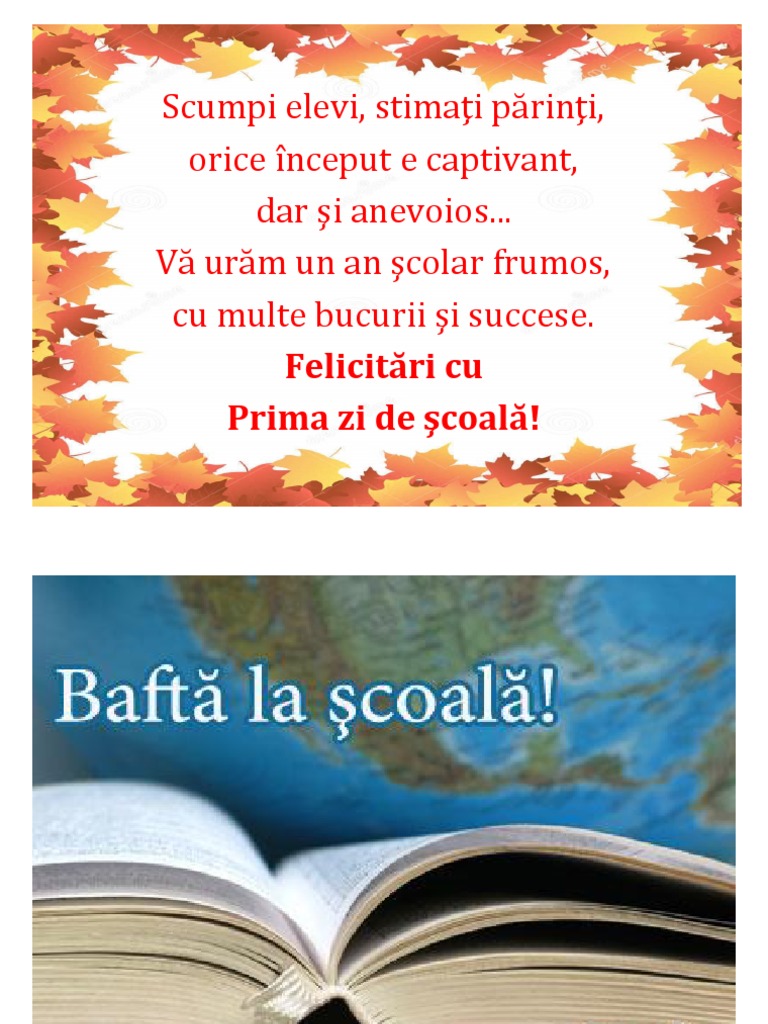 Felicitari cu prima zi de scoala. Sincere felicitări cu prima zi de școală. 3 mult succes în noul an şcolar cu rezultate deosebite şi roade bogate. Mesaje cu finisarea scolii liceului felicitari colegei de banca felicitari de examene mesaje de examene urari cu sustinerea examenelor. La început a fost unul cel compus pentru clasa mea cu gândul de a fi pus pe un orar ce urma a fi dăruit copiilor în prima zi de școală modelul de orar pornind de la literele care compun simbolul clasei în cazul nostru ștrumfii am creat câte un vers.