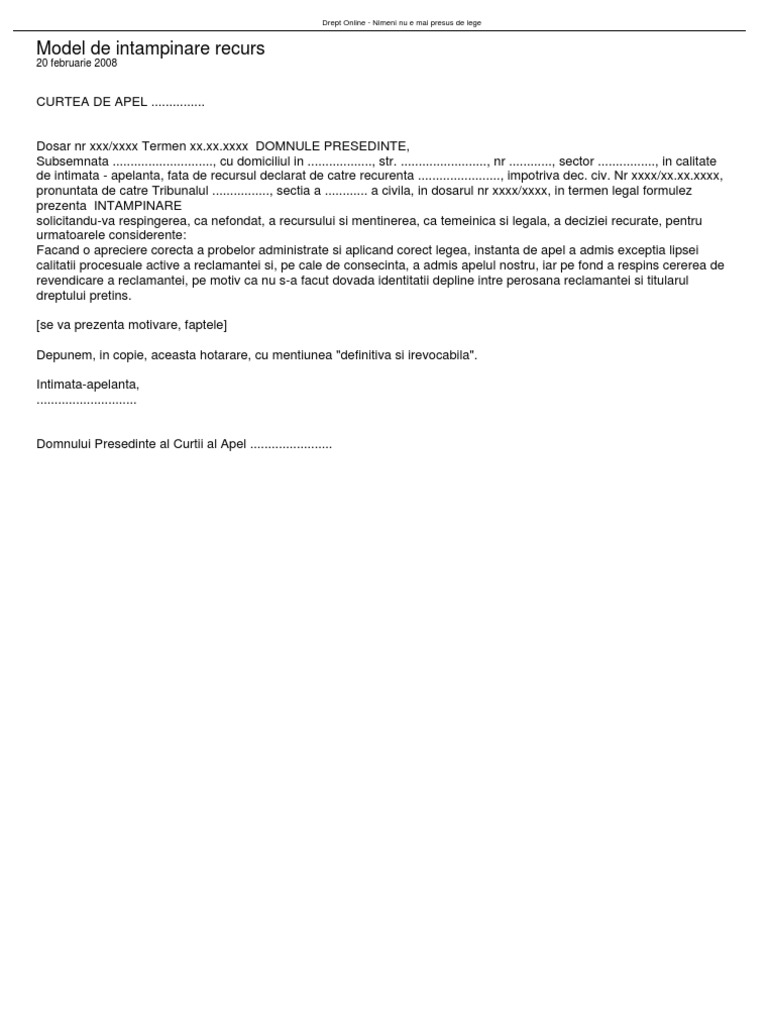 Model Intampinare Recus Curtea De Apel 2012