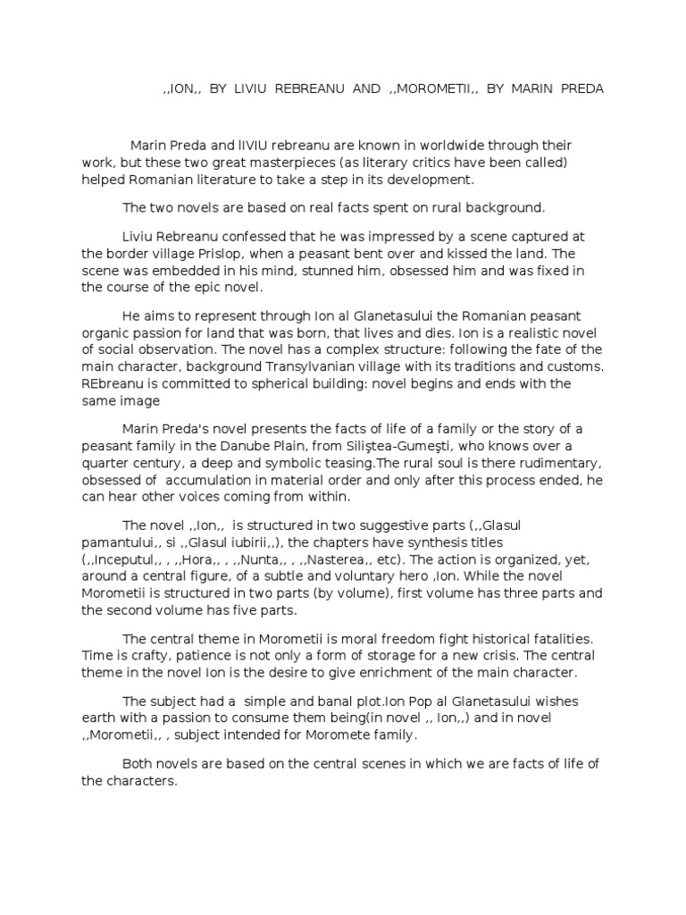 Ion By Liviu Rebreanu And Morometii By Marin Preda
