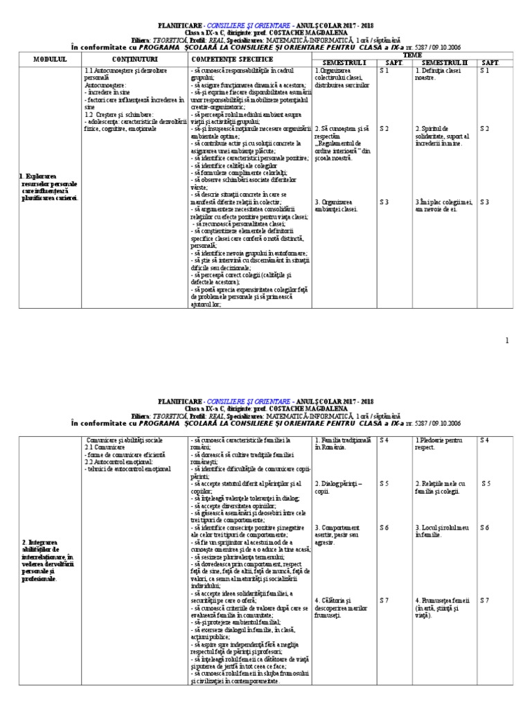 Planificare Consiliere Si Orientare Clasa A 10 Profesionala
