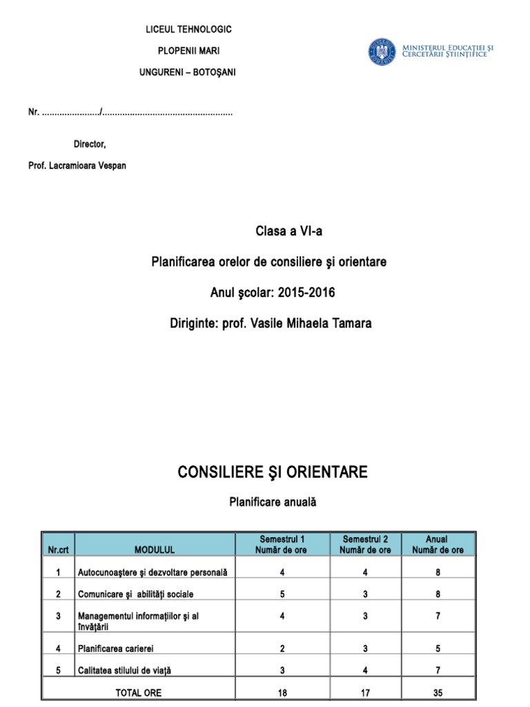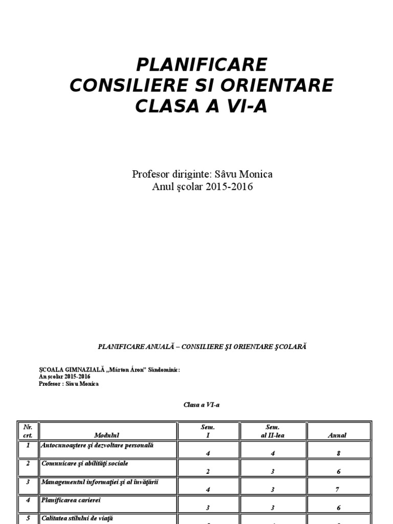 Planificare Consiliere Si Orientare Clasa A Vi A