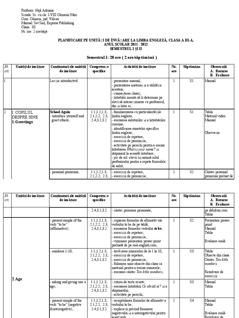 Planificare Pe Unitati De Invatare Clasa 3 Editura Arthur