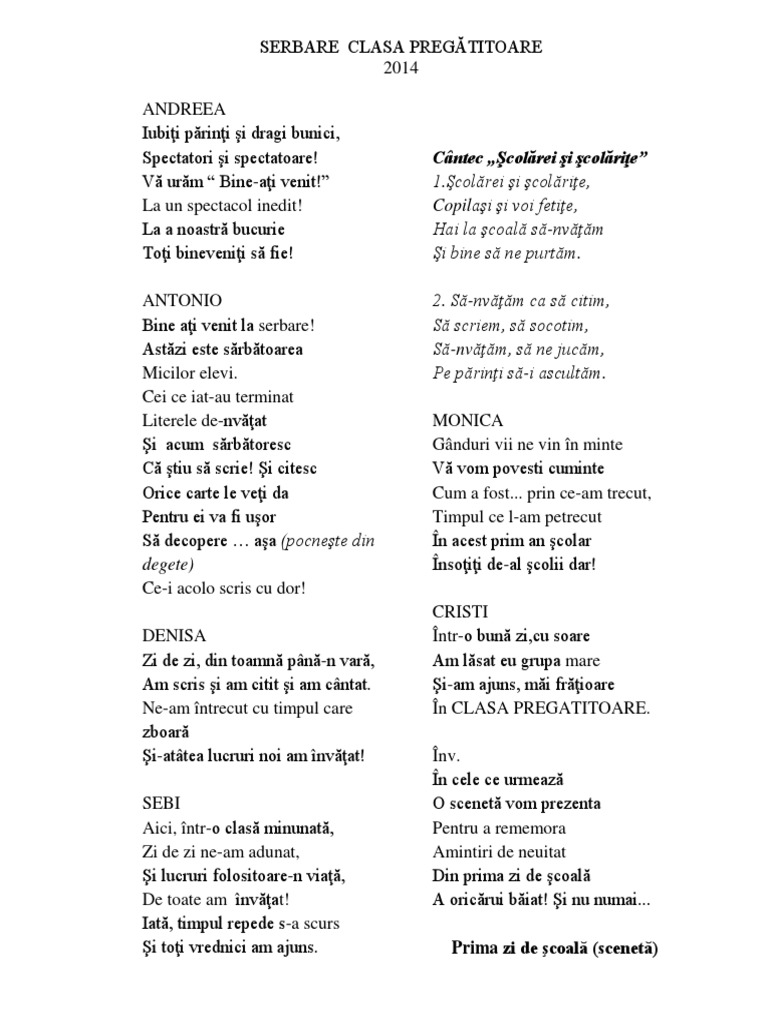 și la școală sunt sărbătorite ziua mamei venirea primăverii începutul și încheierea anului școlar sau ziua copilului așa că v am pregătit câteva poezii pentru clasa pregătitoare pe care micuții le pot recita singuri sau pe roluri. Poezie prima zi de şcoală cursuri şcoala online cursuri online primar cursuri online gimnaziu cursuri online liceu profesorul la clasă ghid practic de pedagogie resurse educaţionale interactive revista cadrelor didactice evenimente diplome pentru evenimente. Princhindeii sunt curioși speriați dar și dornici să învețe și să descopere. Urmează o serie de materiale pentru primele zile de școală în clasa pregătitoare materiale pe care le am inclus în categoria de la grădiniță la școală.