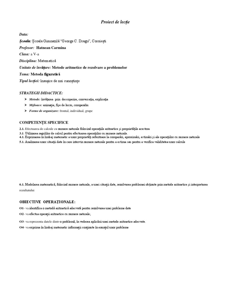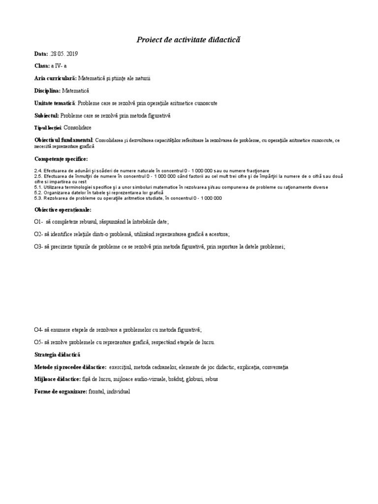 Probleme Care Se Rezolva Prin Metoda Figurativa Clasa 4 Proiect Didactic