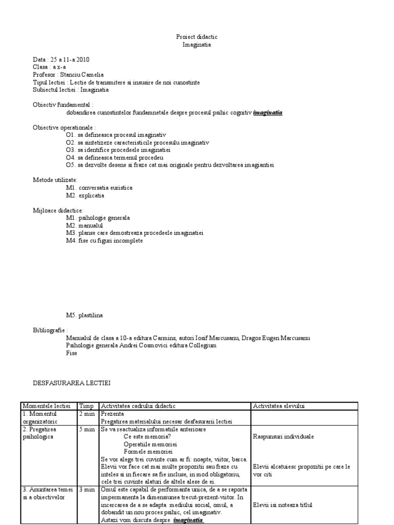 Proiect De Lecţie Good Notes For Psychology Students Studocu